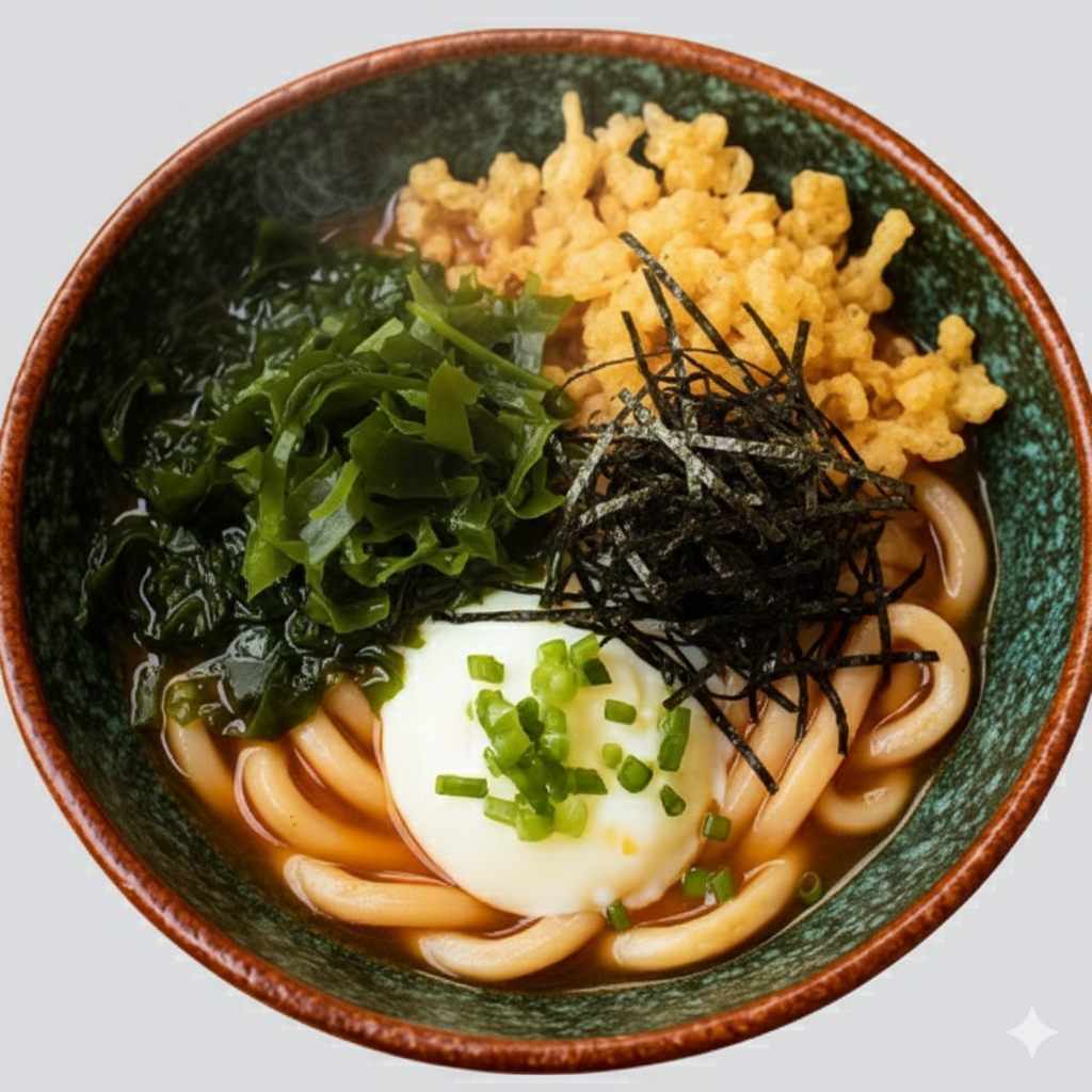 Hot broth flavored with ginger and soy sauce, topped with leeks and a soft-boiled egg.